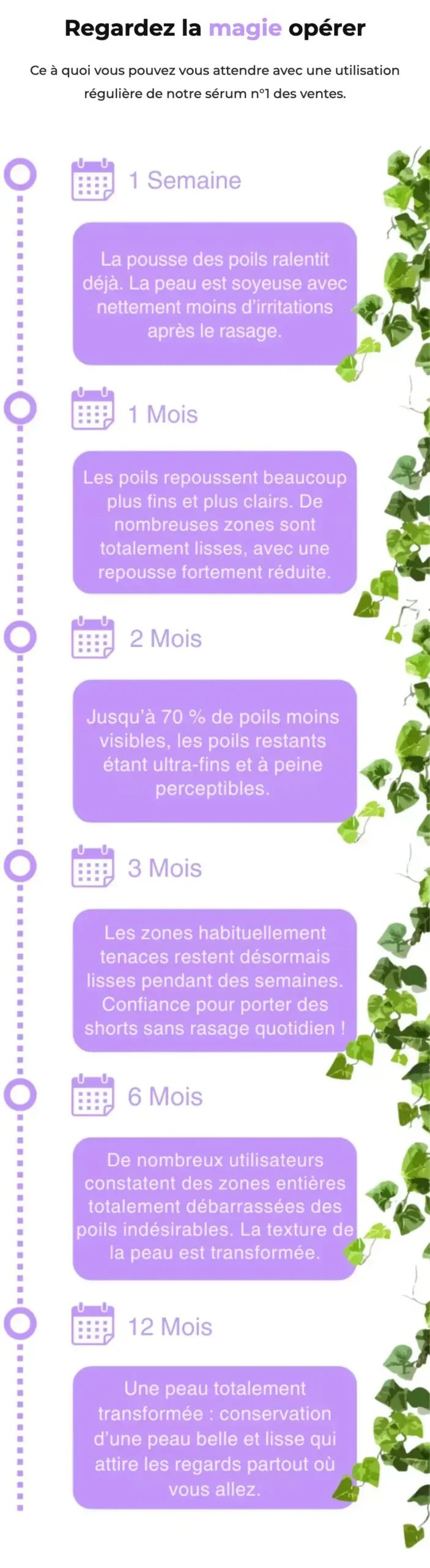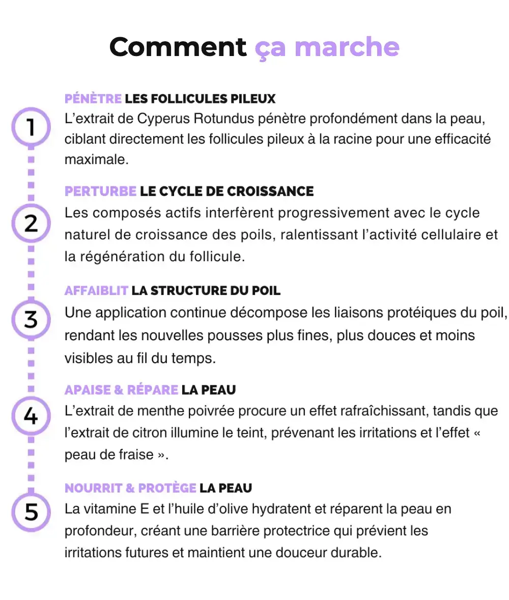 Utilisez-le régulièrement tous les jours, même les jours où vous ne vous épilez pas. C’est tout ! La plupart des gens voient leurs poils repousser plus lentement et plus fins dès les premières semaines.